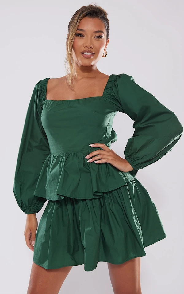 Robe droite en coton vert forêt à étages et manches longues détail dos noué