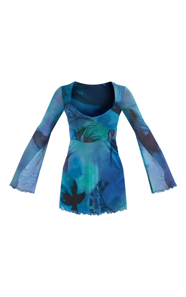 Robe Droite En Mesh Bleu Flou Fleuri à Détail Buste
