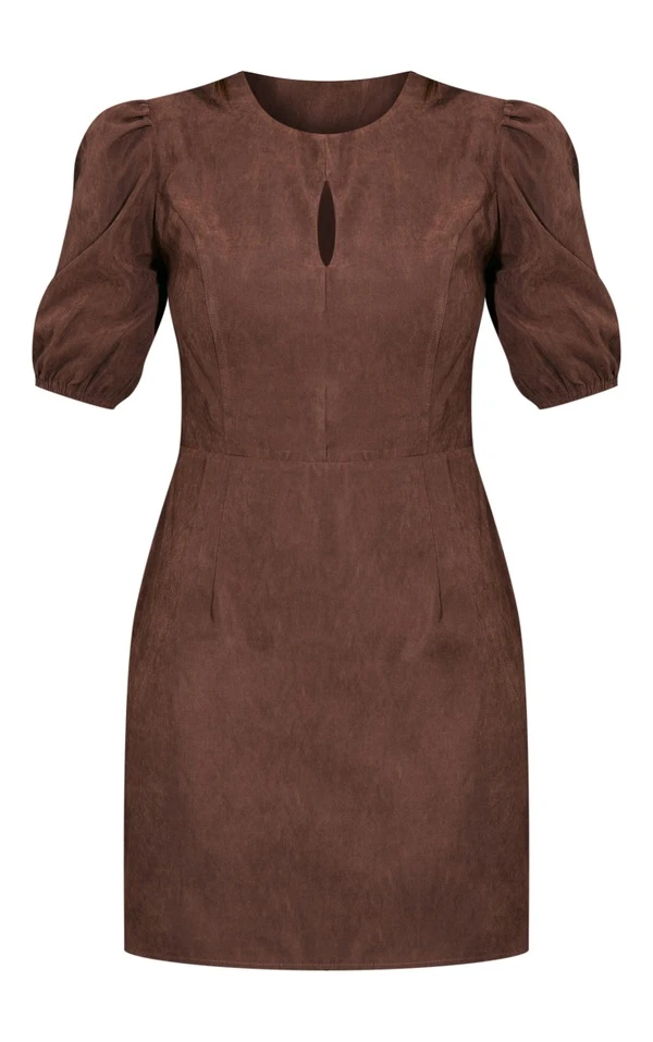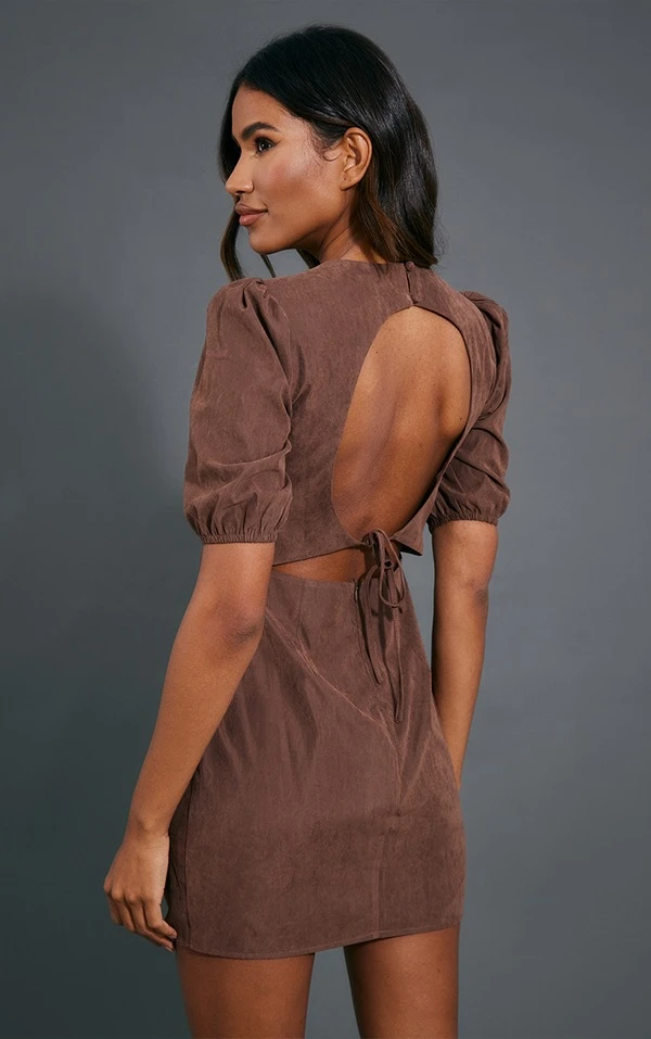 Robe droite en peau de pêche chocolat à manches bouffantes nouée derrière