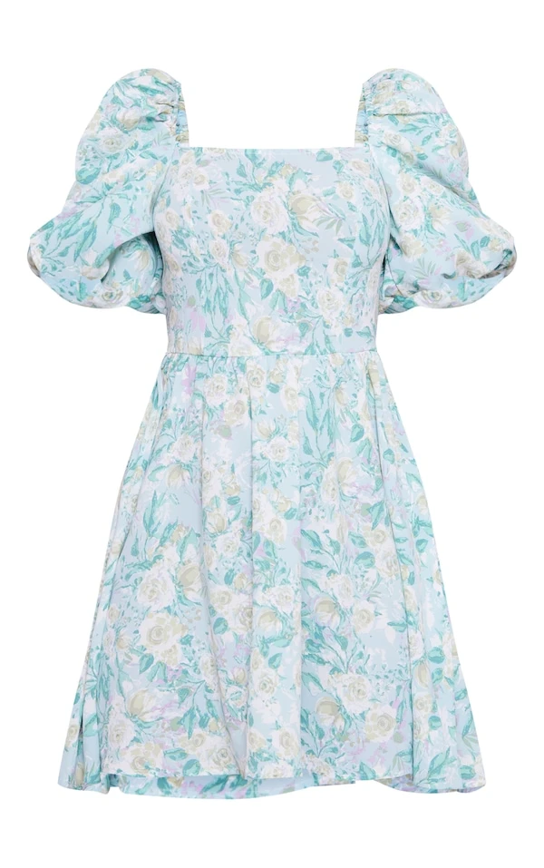 Robe droite fleurie verte à manches bouffantes et taille nouée