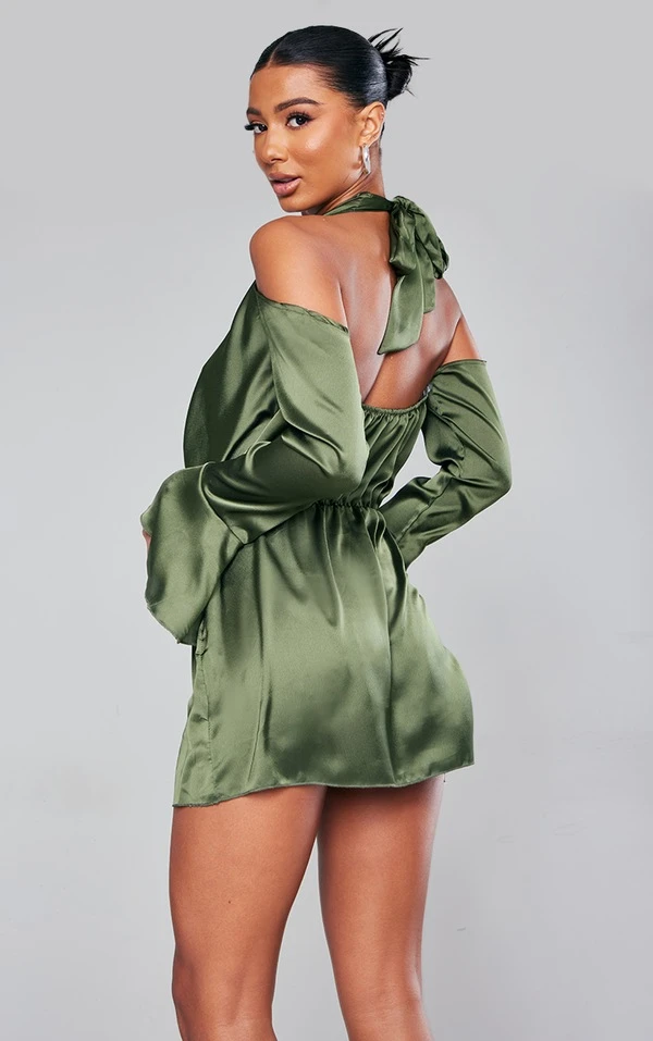 Robe droite satinée kaki à col bénitier et épaules dénudées