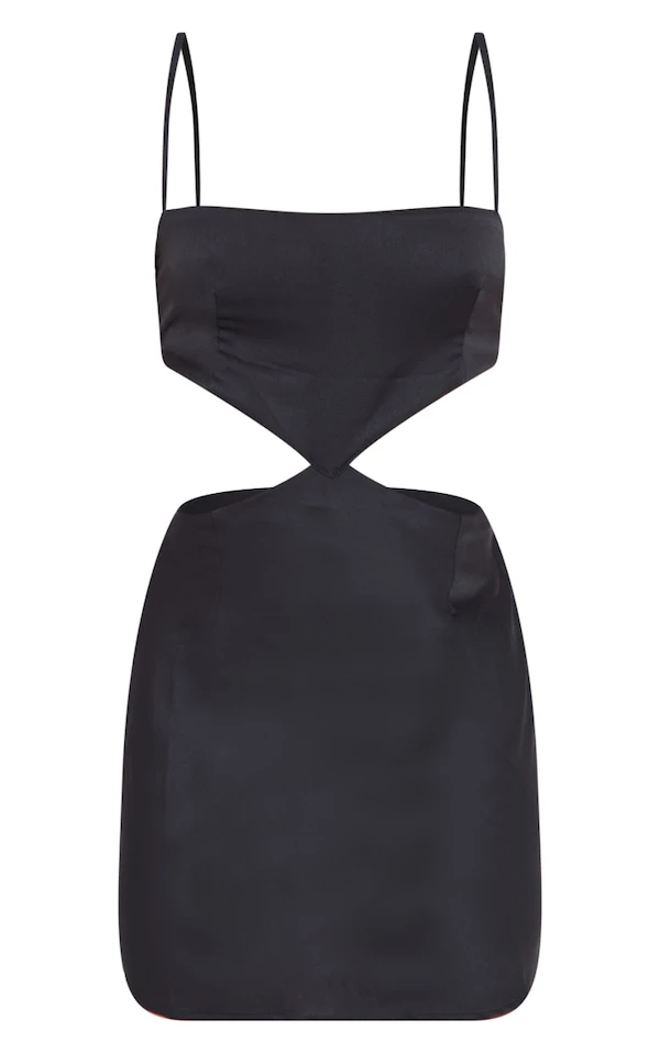 Robe droite satinée noire à découpes sur la taille et bretelles