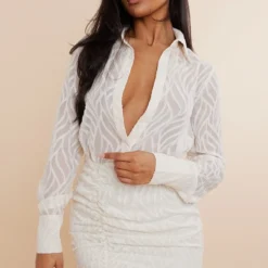 Robe droite texturée transparente crème à boutons et jupe froncée