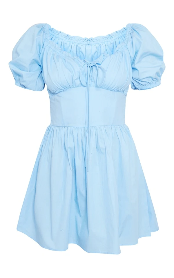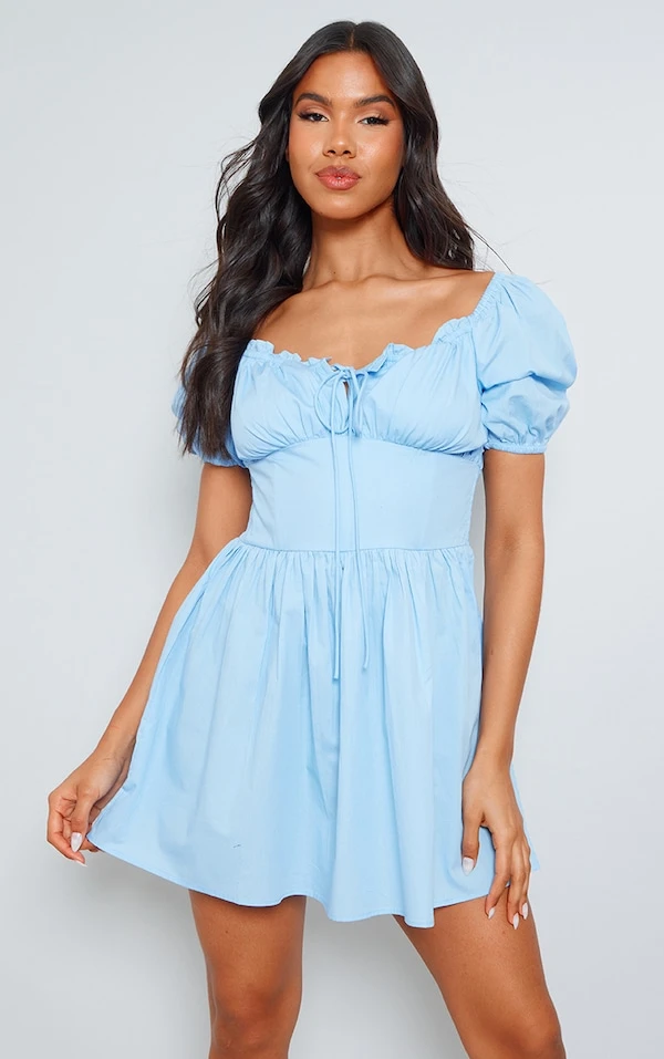 Robe droite volantée bleu clair à manches bouffantes et détail corset