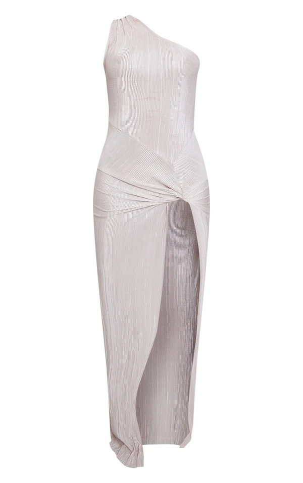 Robe fendue longue plissée gris pierre à épaule unique et noeud