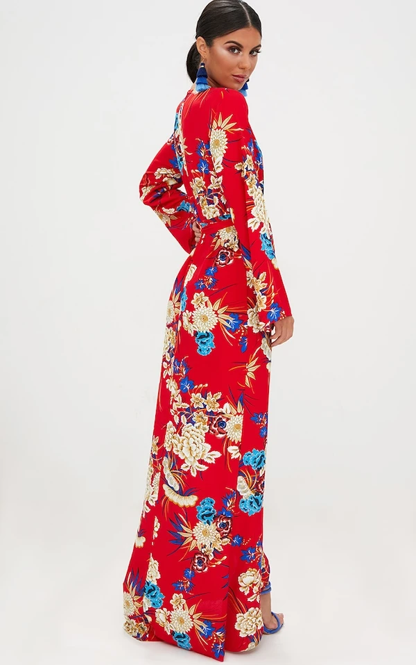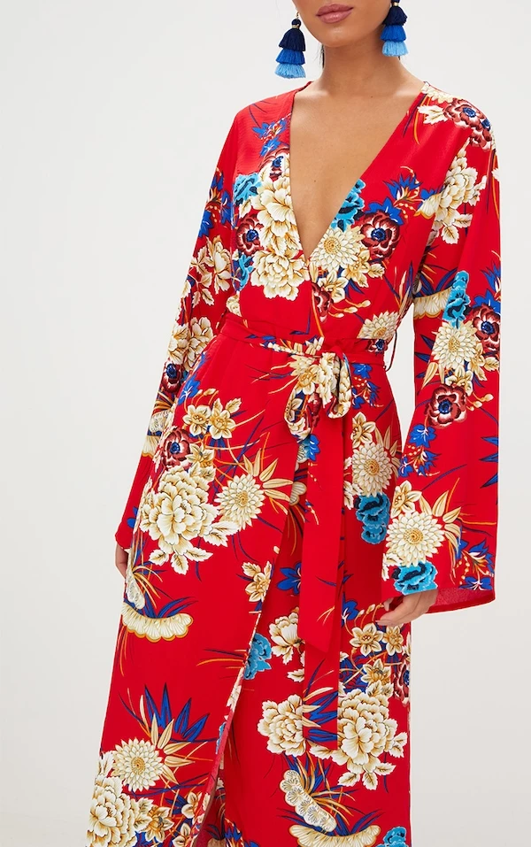 Robe kimono longue rouge à imprimé floral