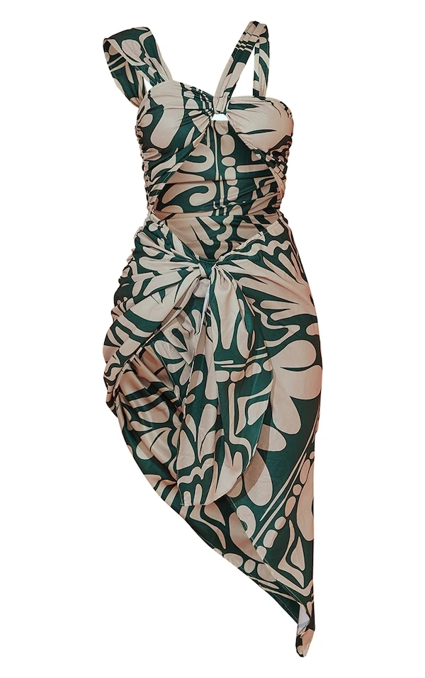 Robe longue asymétrique vert foncé imprimé abstrait à découpes et dos nu