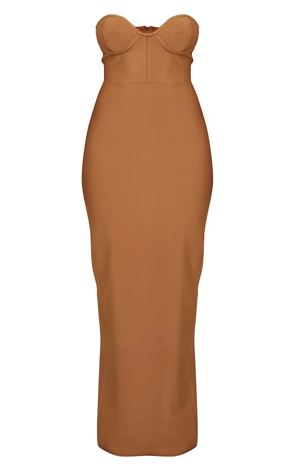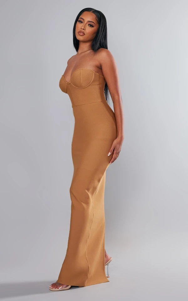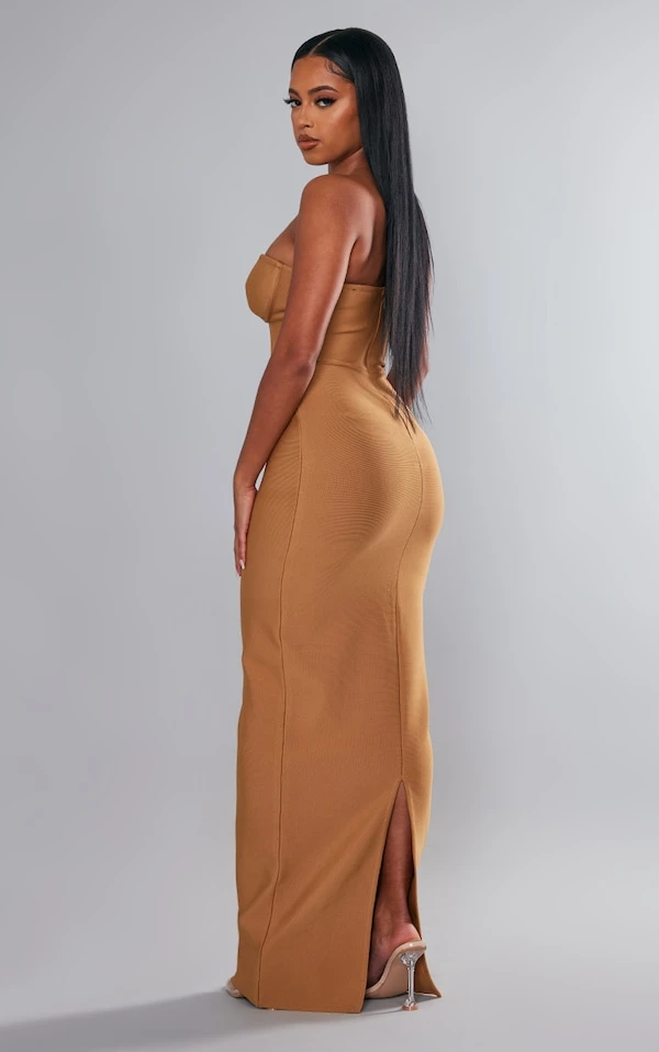 Robe longue bustier camel à détail corset et derrière fendu