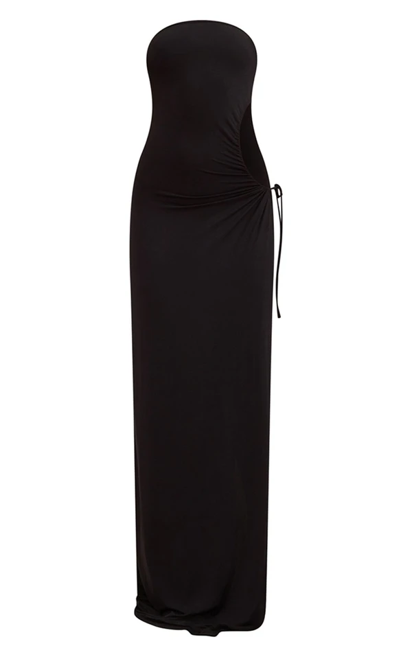 Robe longue bustier moulante noire découpée froncée sur le côté