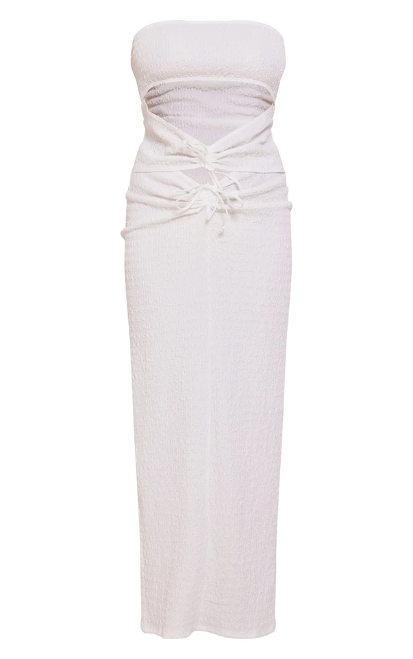 Robe longue bustier texturée froncée blanche à découpes