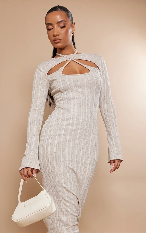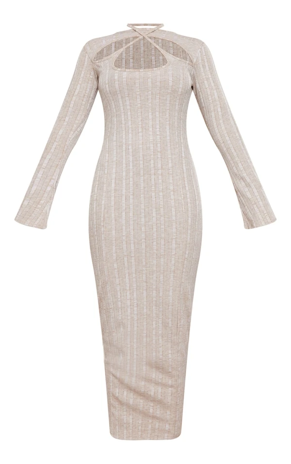 Robe longue côtelée avoine découpée à nouer dans le cou
