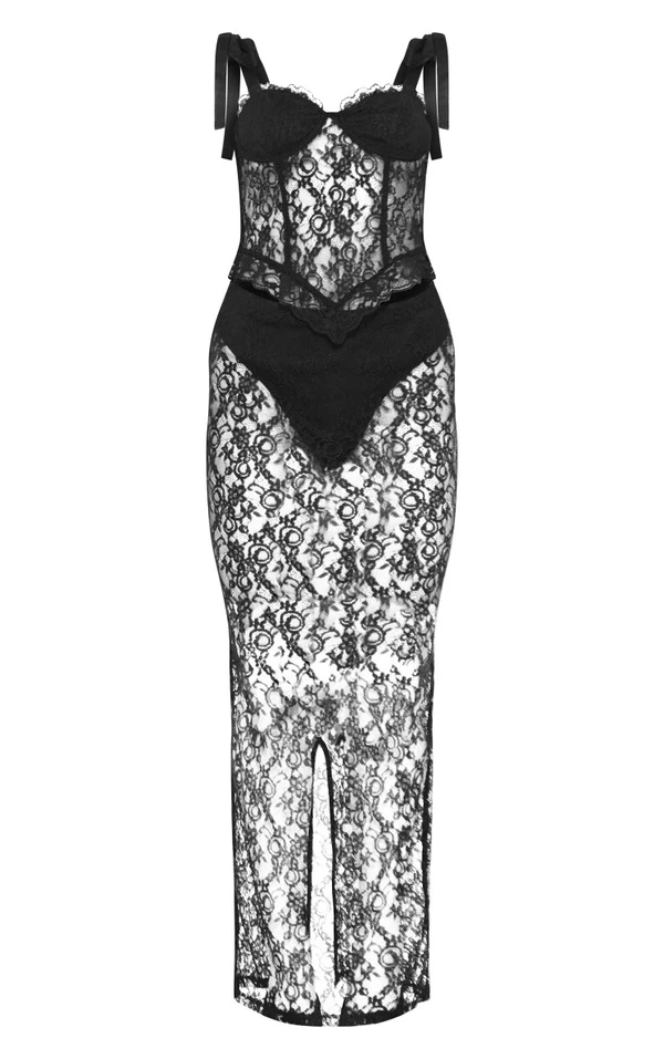 Robe longue en dentelle transparente noire à bretelles nouées et lacets