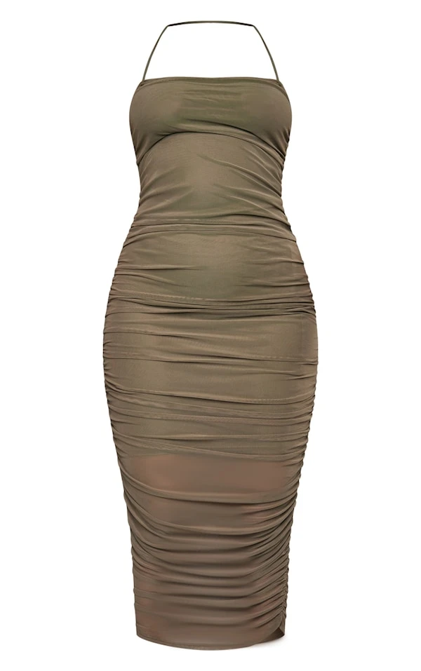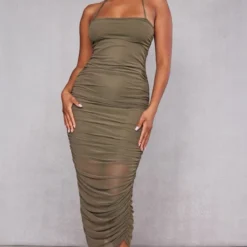 Robe longue en mesh très froncé kaki croisée sur le cou