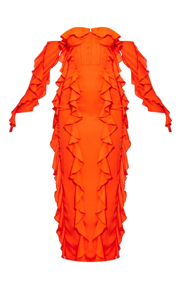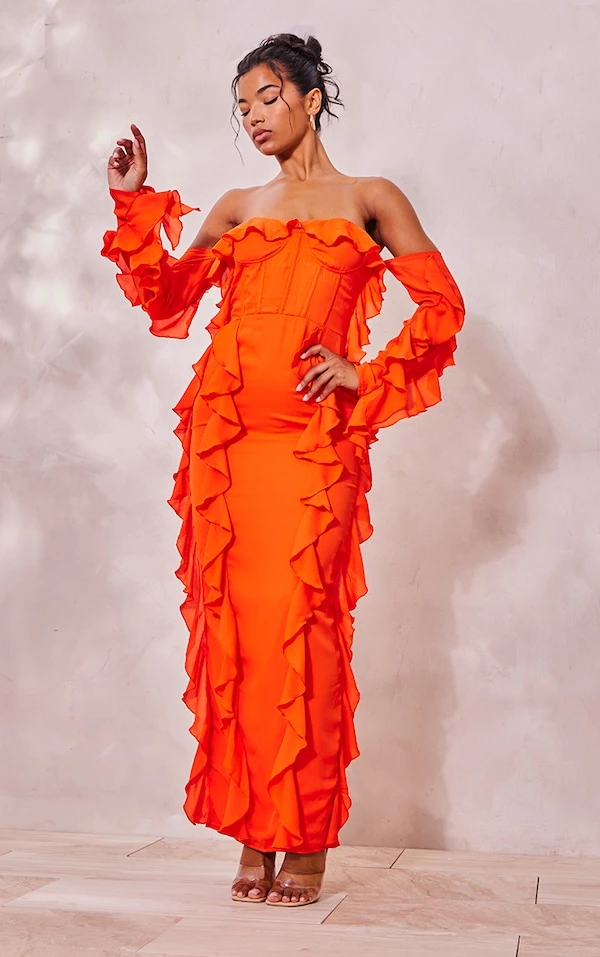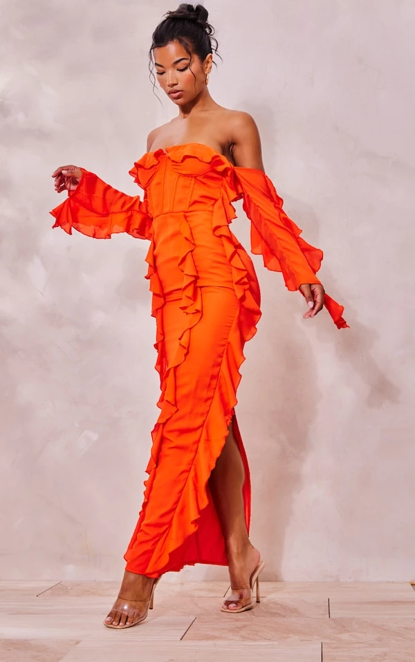 Robe longue en mousseline de soie orange brûlé à corset et manches longues