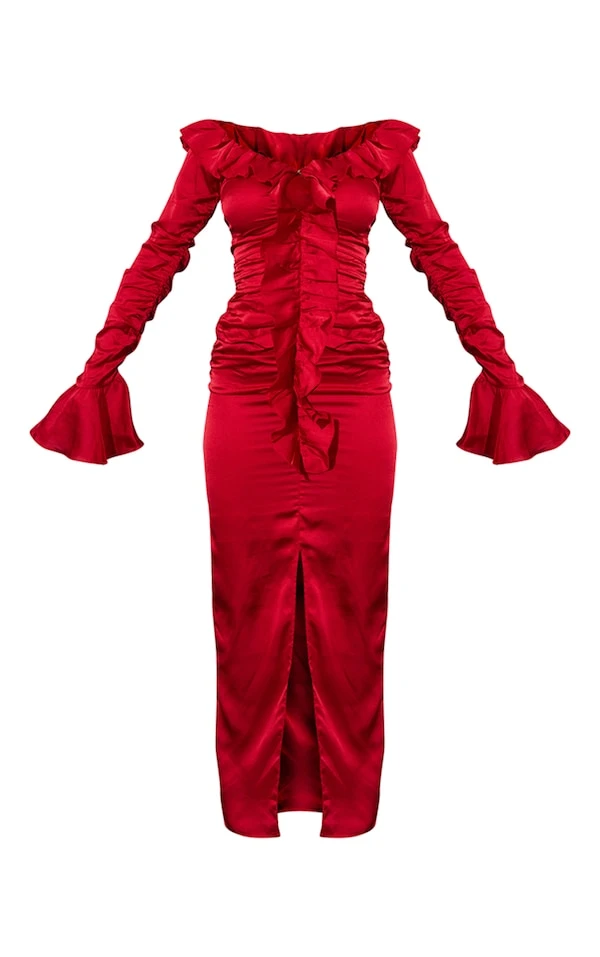 In love de la couleur rouge de cette robe. Avec sa longueur, ses manches longues et l’effet froncé de sa matière à volants, on l’adore. En soirée, portez-la avec une paire de mules et quelques accessoires pour attirer tous les regards sur vous !