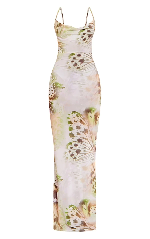 Robe longue moulante verte imprimé papillons à col bénitier