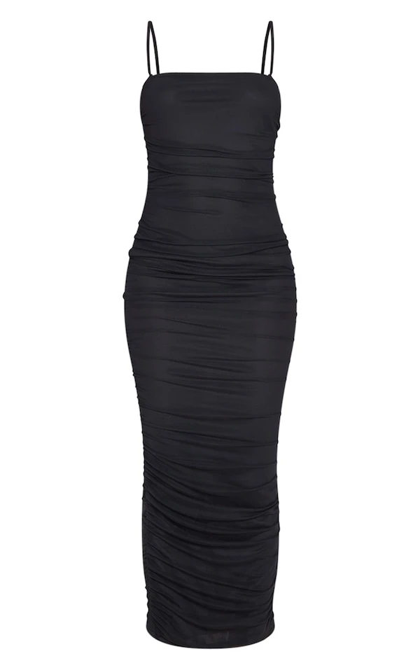 Faites tourner les têtes avec ce look les filles! Sa matière noire froncée, son col droit et sa coupe moulante n’ont besoin que de talons discrets et d’accessoires pour un parfait look pour le week-end.