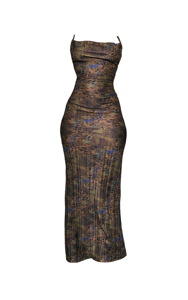 Robe longue plissée multicolore à imprimé léopard et bretelles