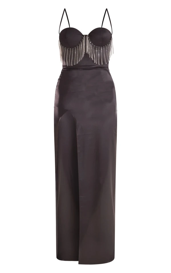 Absolument in love de cette robe longue ! On aime beaucoup le design portefeuille de sa jupe, sa couleur noire et surtout les franges de strass sur les bonnets. Une robe shiny qui se porte en soirée de gala pour en mettre plein la vue !