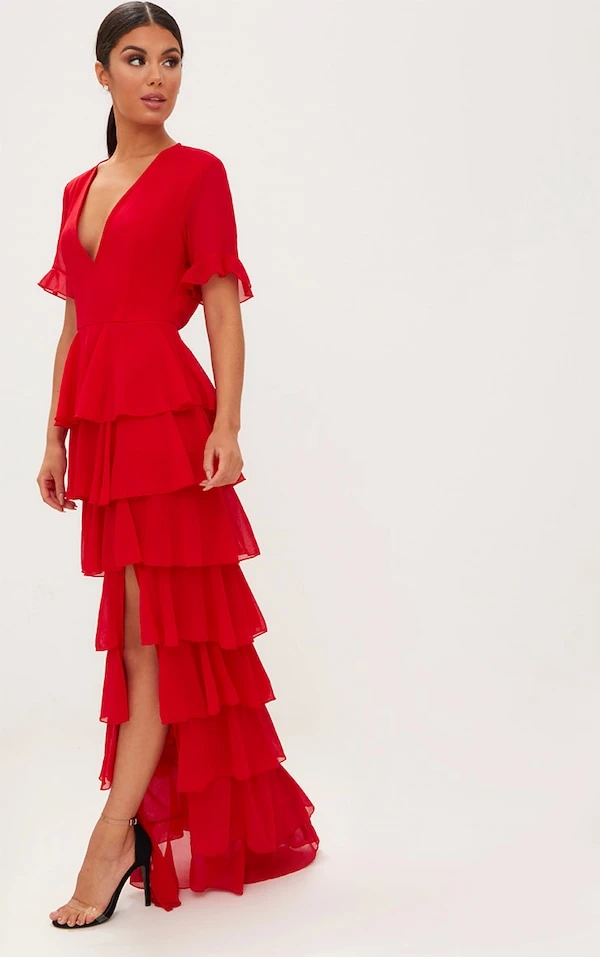 Robe longue rouge en mousseline à volants