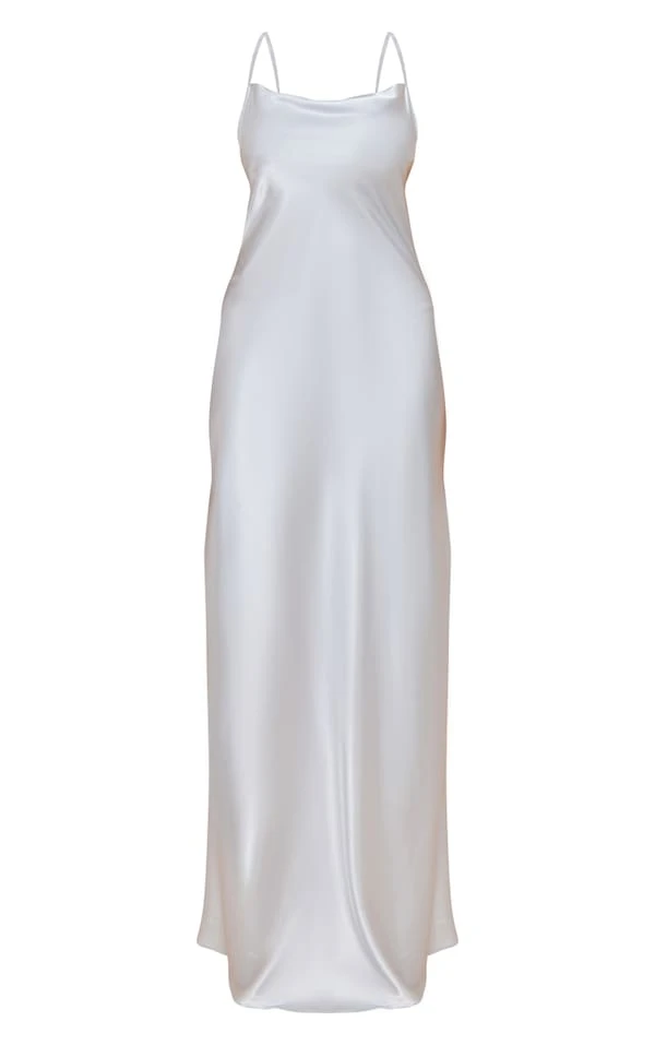 Robe longue satinée argentée à col bénitier nouée dans le dos