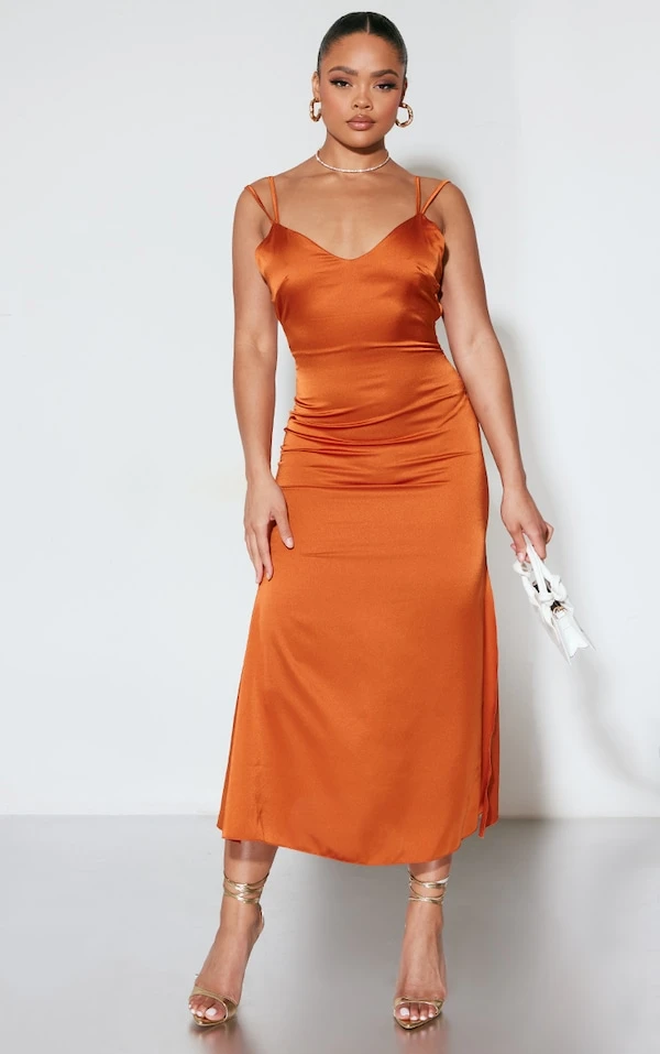 Robe longue satinée rouille à doubles bretelles nouée dans le dos