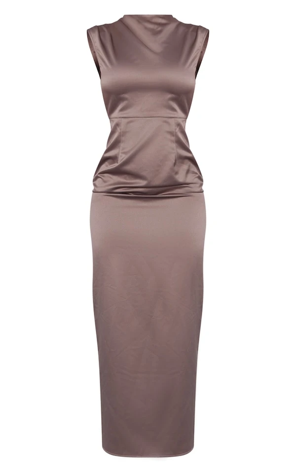 Robe longue satinée taupe à dos découpé et derrière froncé