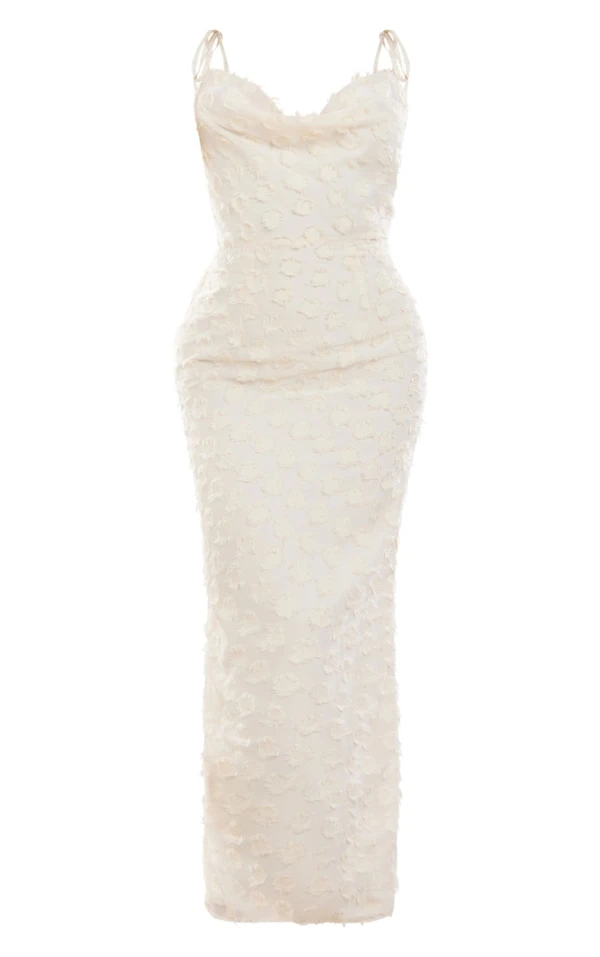 Robe longue texturée crème élimée à bretelles et col bénitier