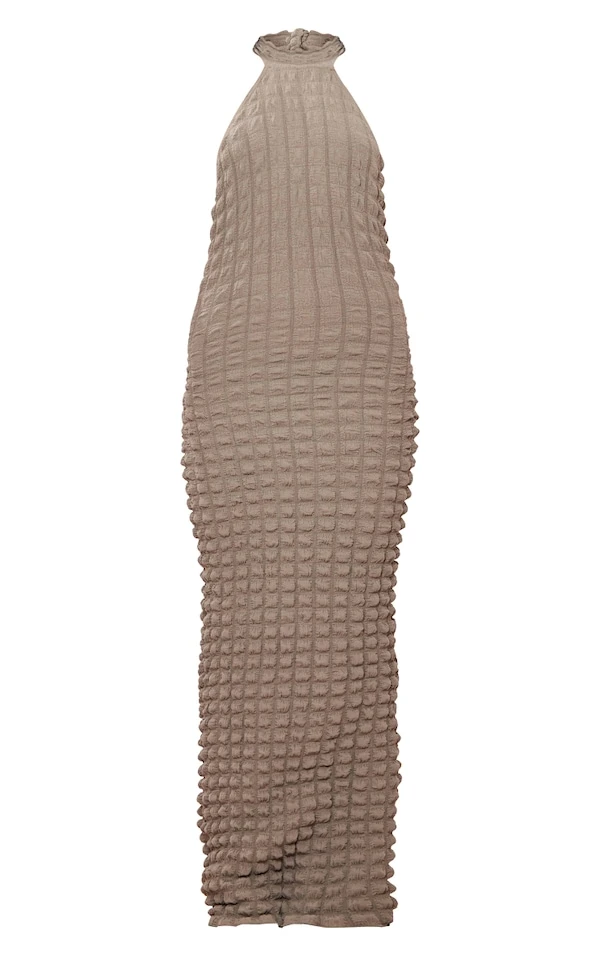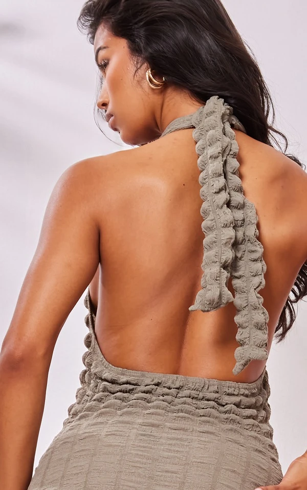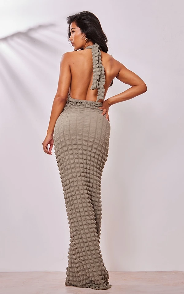Robe longue texturée kaki effet bulle à dos nu