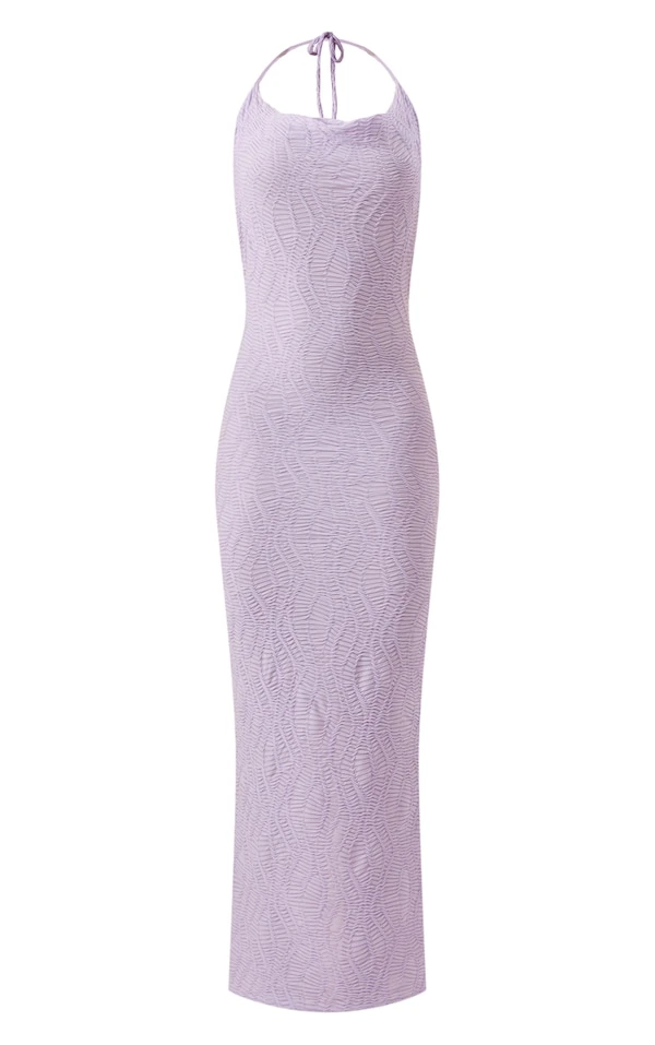 Robe longue texturée lilas nouée au dos à col bénitier et derrière froncé