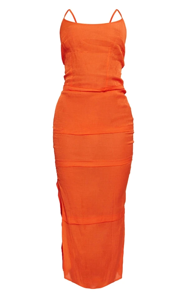 Robe longue texturée orange métalisée à lanières croisées dans le dos