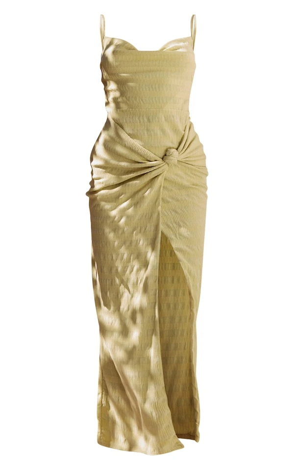 Sublime dans cette robe longue ! Avec sa couleur vert olive, son col bénitier noué et sa matière texturée, elle est déjà culte. On vous conseille de la porter avec une paire de talons et quelques accessoires pour finaliser votre look de soirée. Go passer la nuit sur le dancefloor !