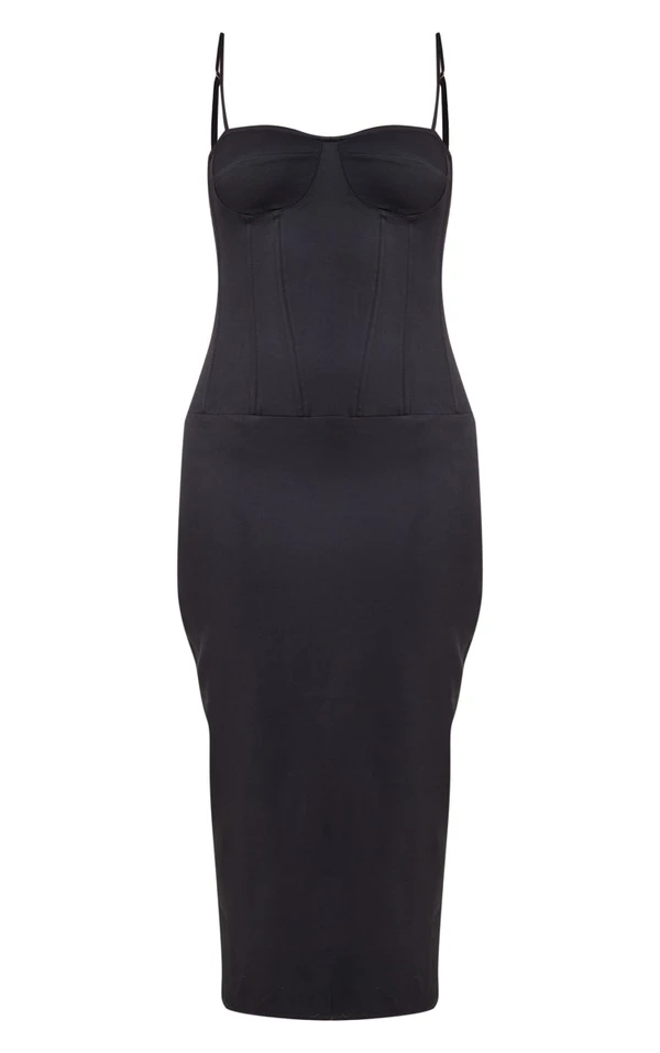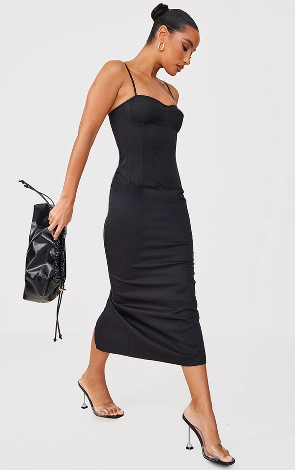 Sublime cette robe à la coupe longue très classe ! On est in love de sa matière tissée noire et son détail corset juste magnifique. On l’assoccie à une paire de talons transparents et quelques accessoires pour un dîner chic. Le look est royal !