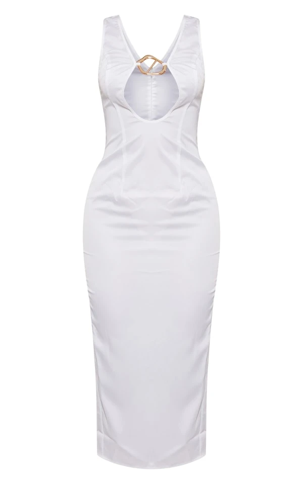 Robe mi-longue blanche satinée décolletée à bretelles et empiècement