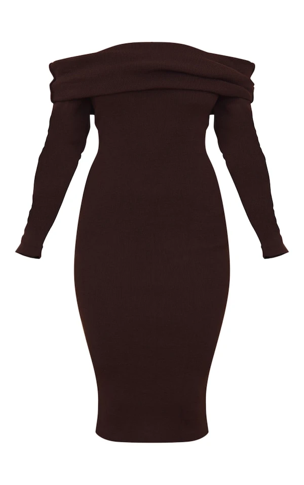 Robe mi-longue chocolat en maille tricot à col bardot
