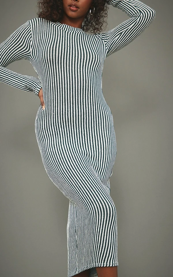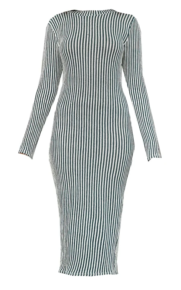 Robe mi-longue côtelée bicolore kaki à col montant