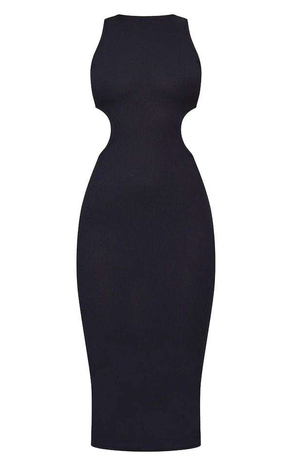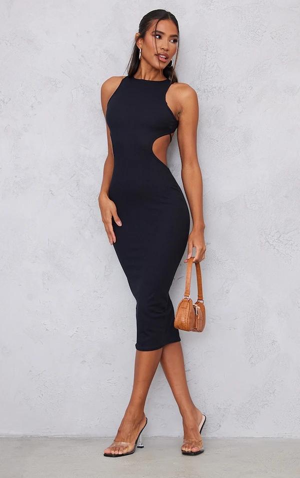 Robe mi-longue côtelée noire découpée sur les côtés