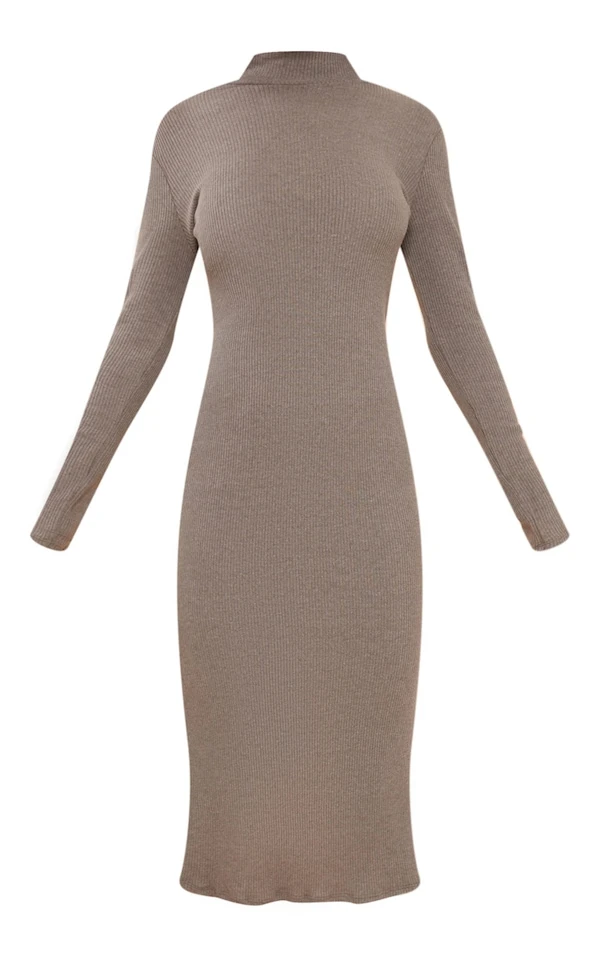 Robe mi-longue côtelée vert sauge kaki à col haut et manches longues