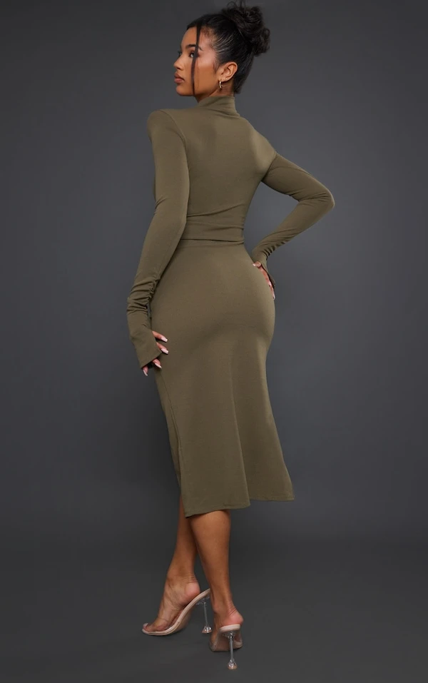 Robe mi-longue crêpée kaki à col montant et manches fendues