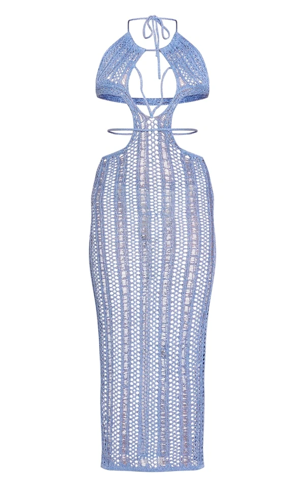 Robe mi-longue découpée en maille tricot ajourée bleue à paillettes