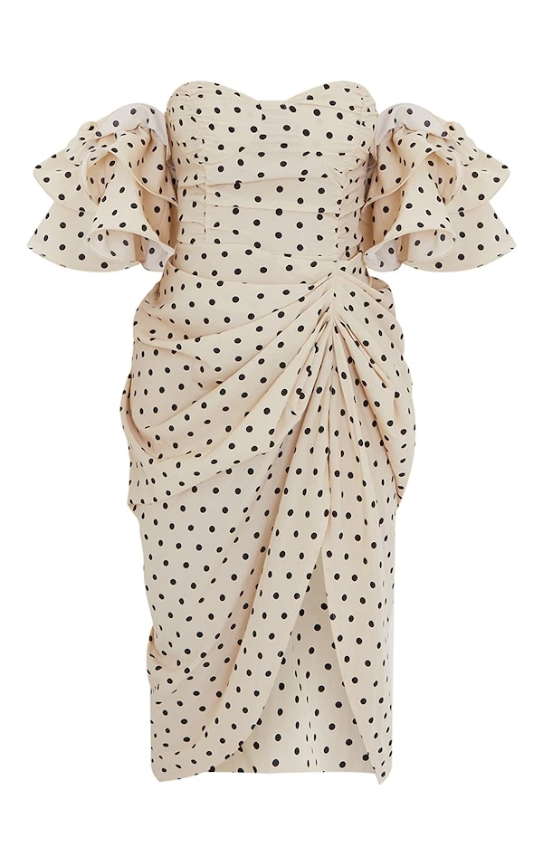 Robe mi-longue drapée crème imprimé pois à col bardot et manches volantées