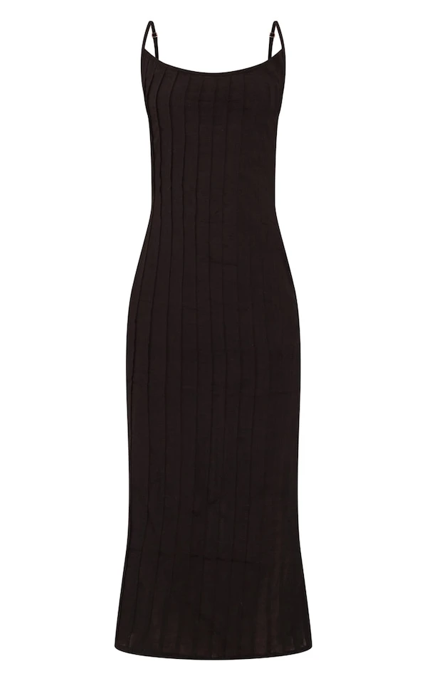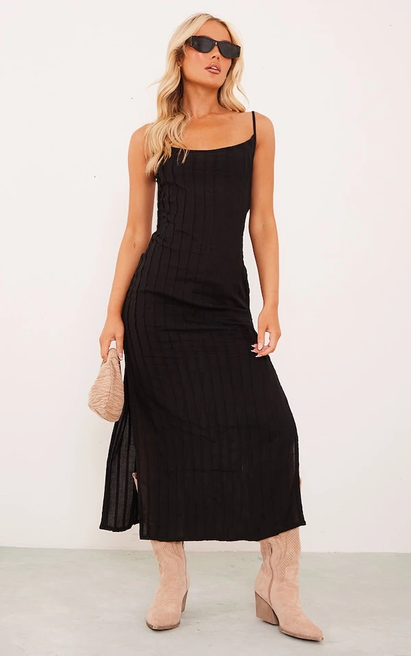 Robe mi-longue effet lin noire plissée fendue sur le côté