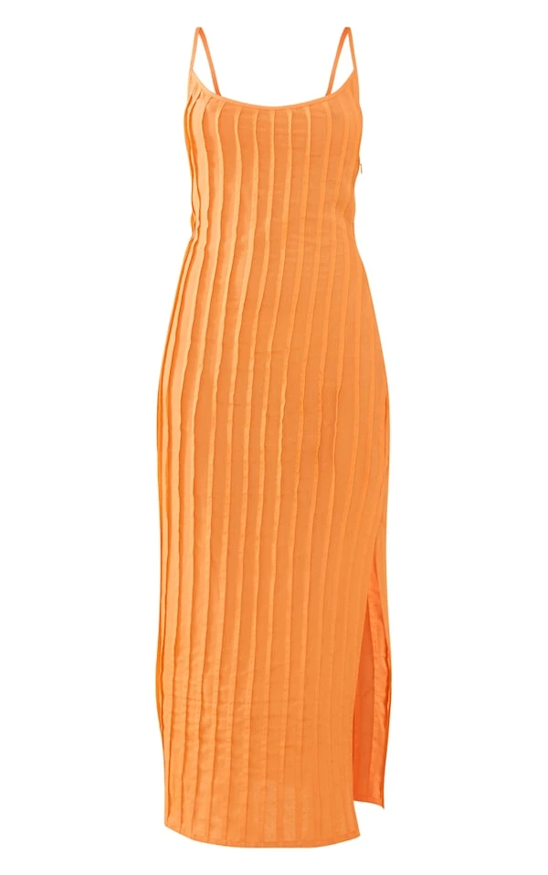 Robe mi-longue effet lin orange plissée fendue sur le côté