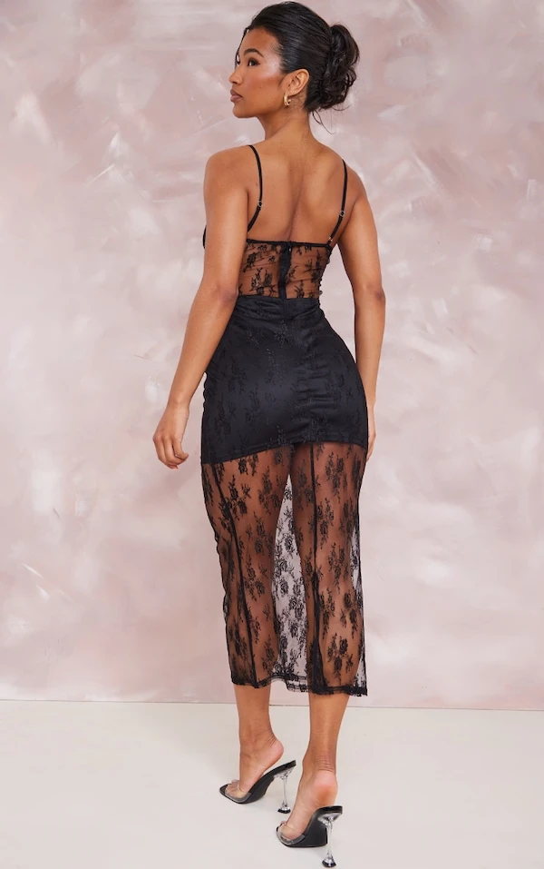Robe mi-longue en dentelle noire à bretelles et détail découpe