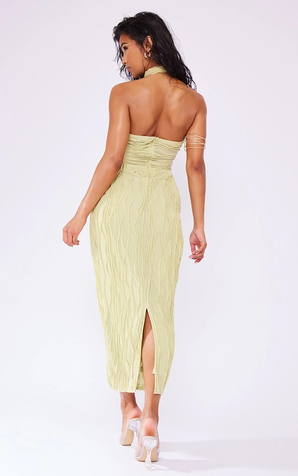Robe mi-longue en jersey texturé vert sauge à bretelles croisées au cou