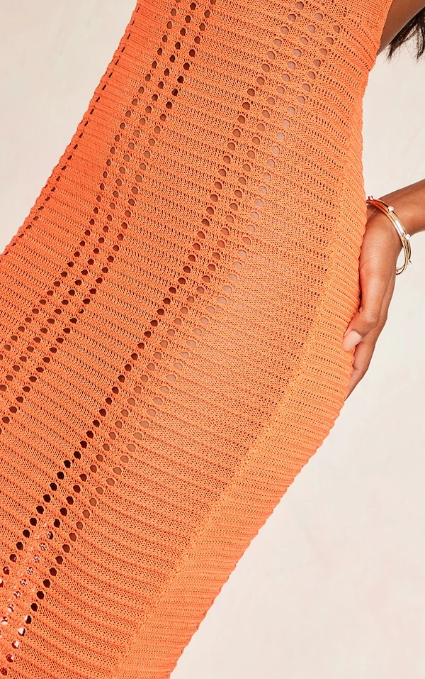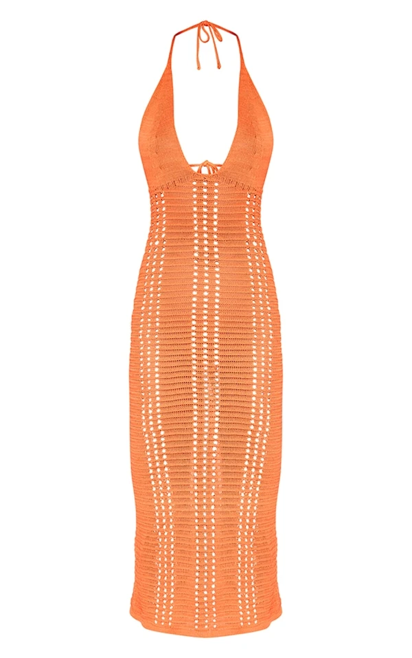 Robe mi-longue en maille crochet orange brûlé fleurie