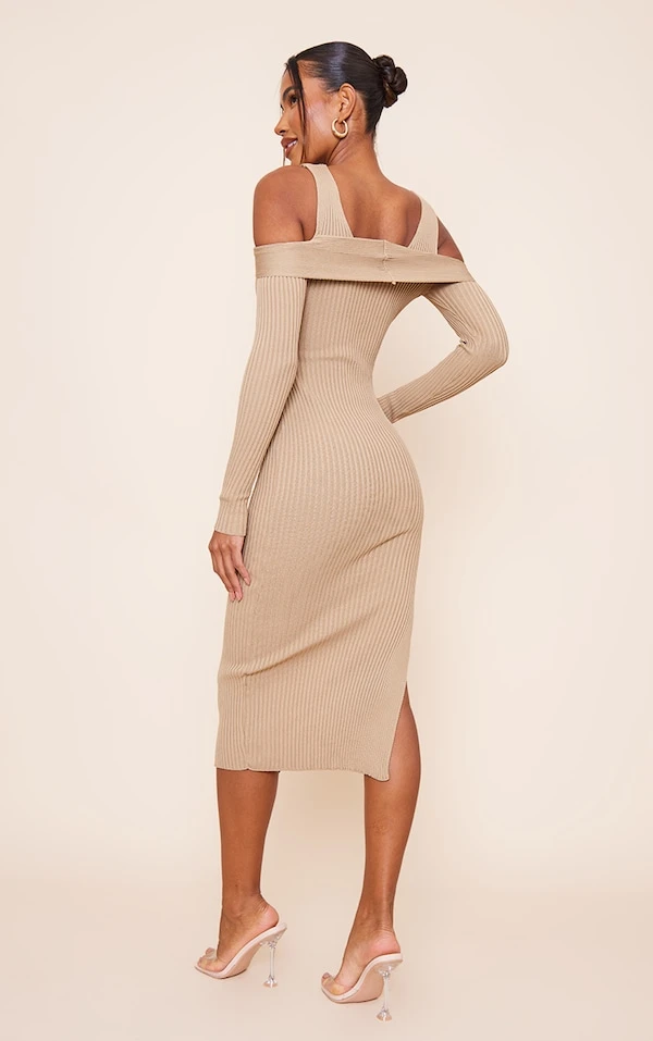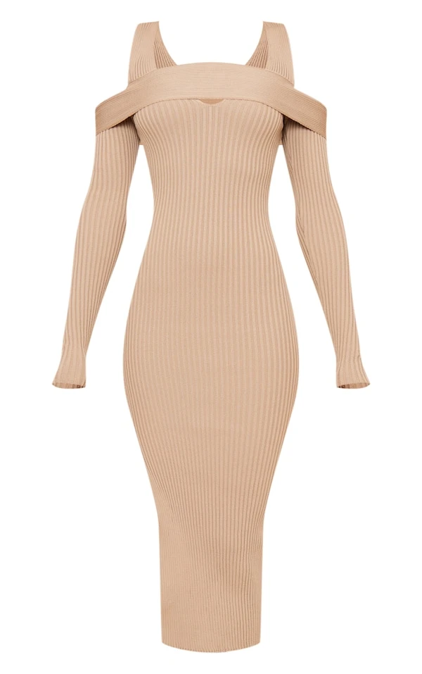 Robe Mi-longue En Maille Tricot Côtelée Camel à Manches Longues Et Rabat