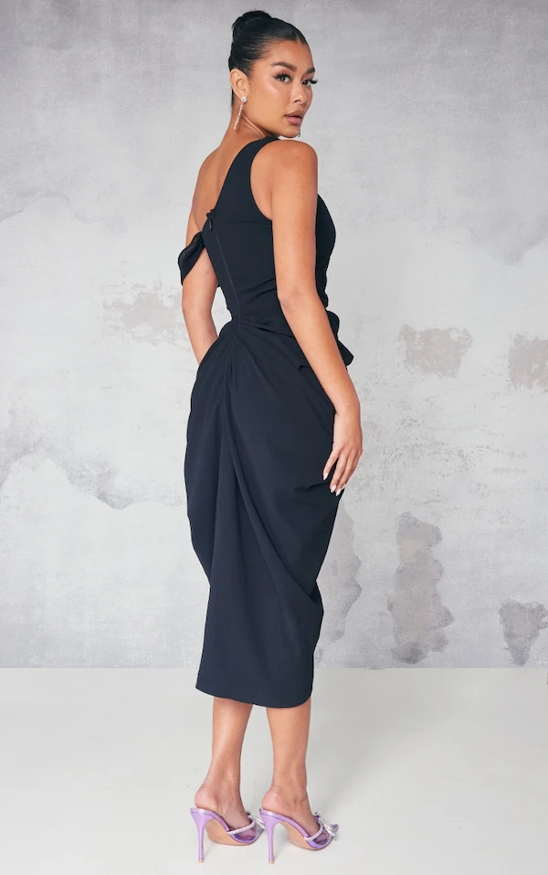 Robe mi-longue en mousseline de soie noire à bretelle asymétrique et drapé