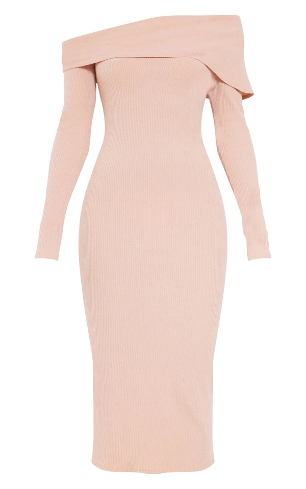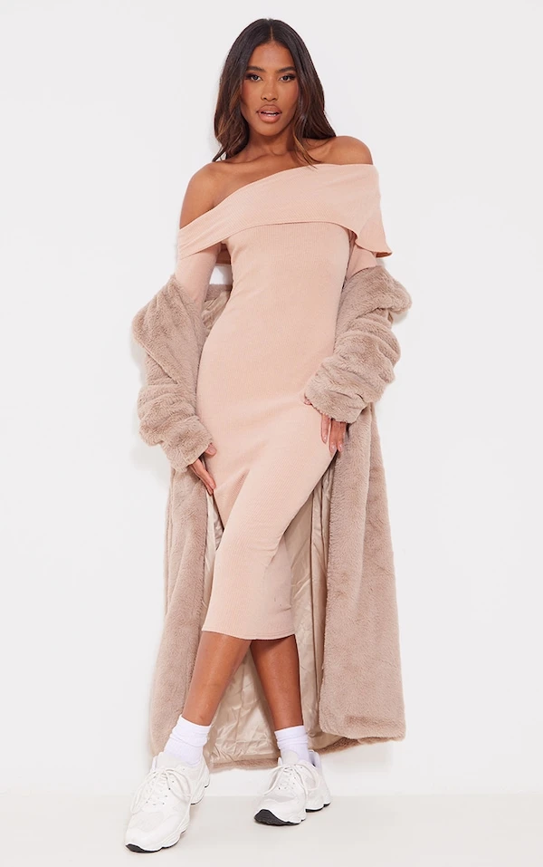 Robe mi-longue gris pierre côtelée brossée asymétrique