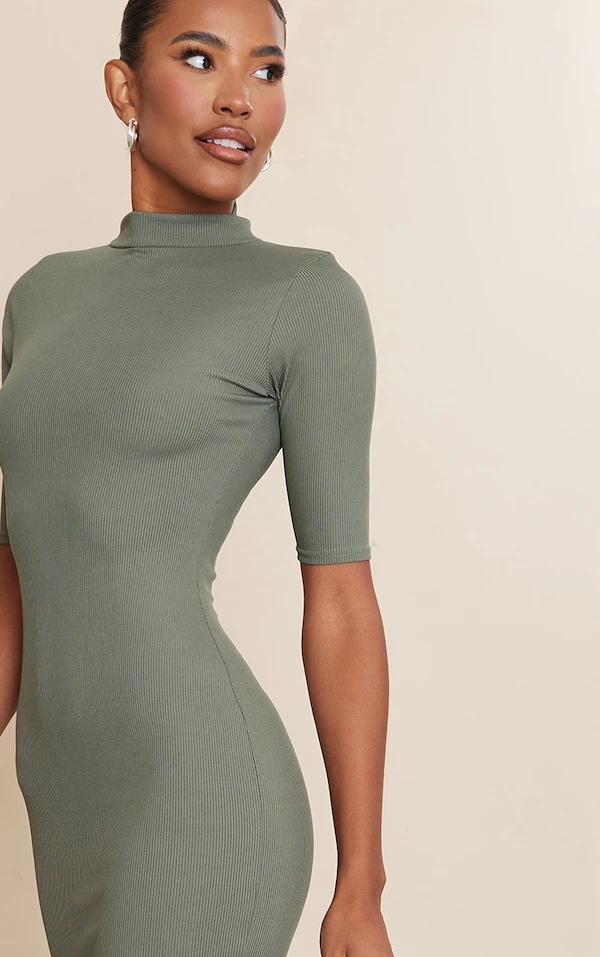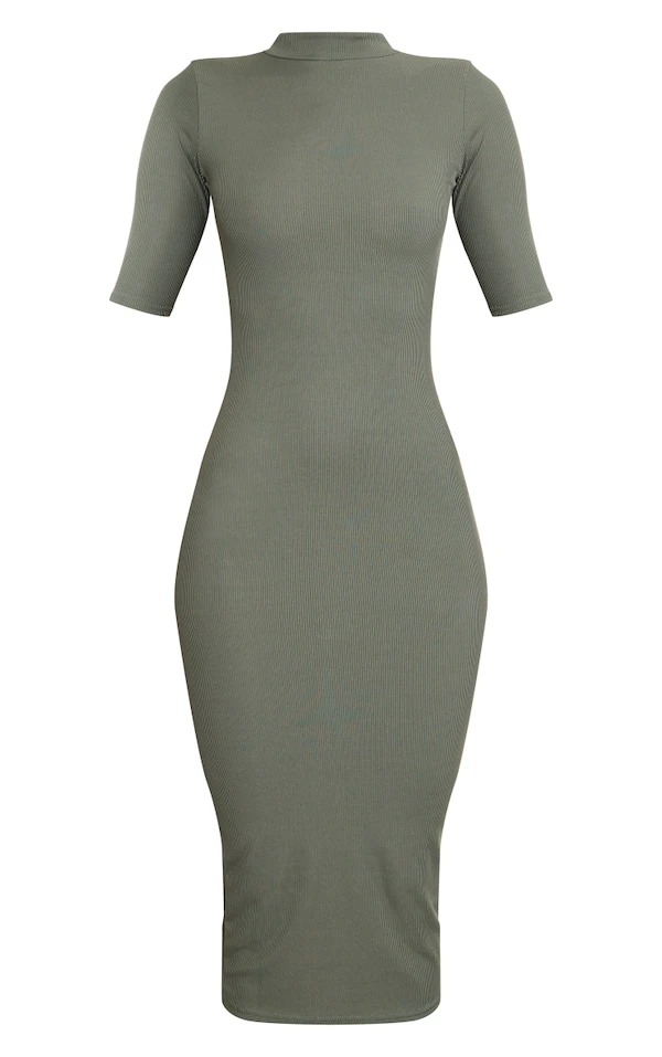 Robe mi-longue kaki à col haut et manches courtes